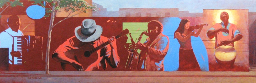 The Songs of Our City mural is 80ft long and celebrates New London’s rich immigrant cultural community and its musical history, from the jazz saxophonist and the classical cellist, to the Spanish guitar and the beats of the conga drums. – InkCT. New London Mural Project: A Walk to Remember by Nancy LaMar-Rodgers.